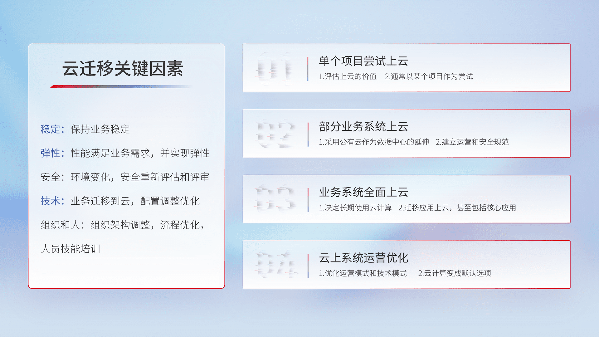 结合实际业务,,,,从规划设计、、、、云平台选型、、云原生改造、、、数据迁移、、集成交付,,,迁移全过程为客户识别最佳上云路径,,做好风险识别管理,,设计网络架构、、身份权限、、、、安全审计合规、、操作审计、、日志审计、、、、监控告警策略、、、、多站点容灾设计等,,,对云上基础设施进行整体规划,,提升IT治理水平,,以满足弹性、、、、高可用、、、高性能的需求。。。。