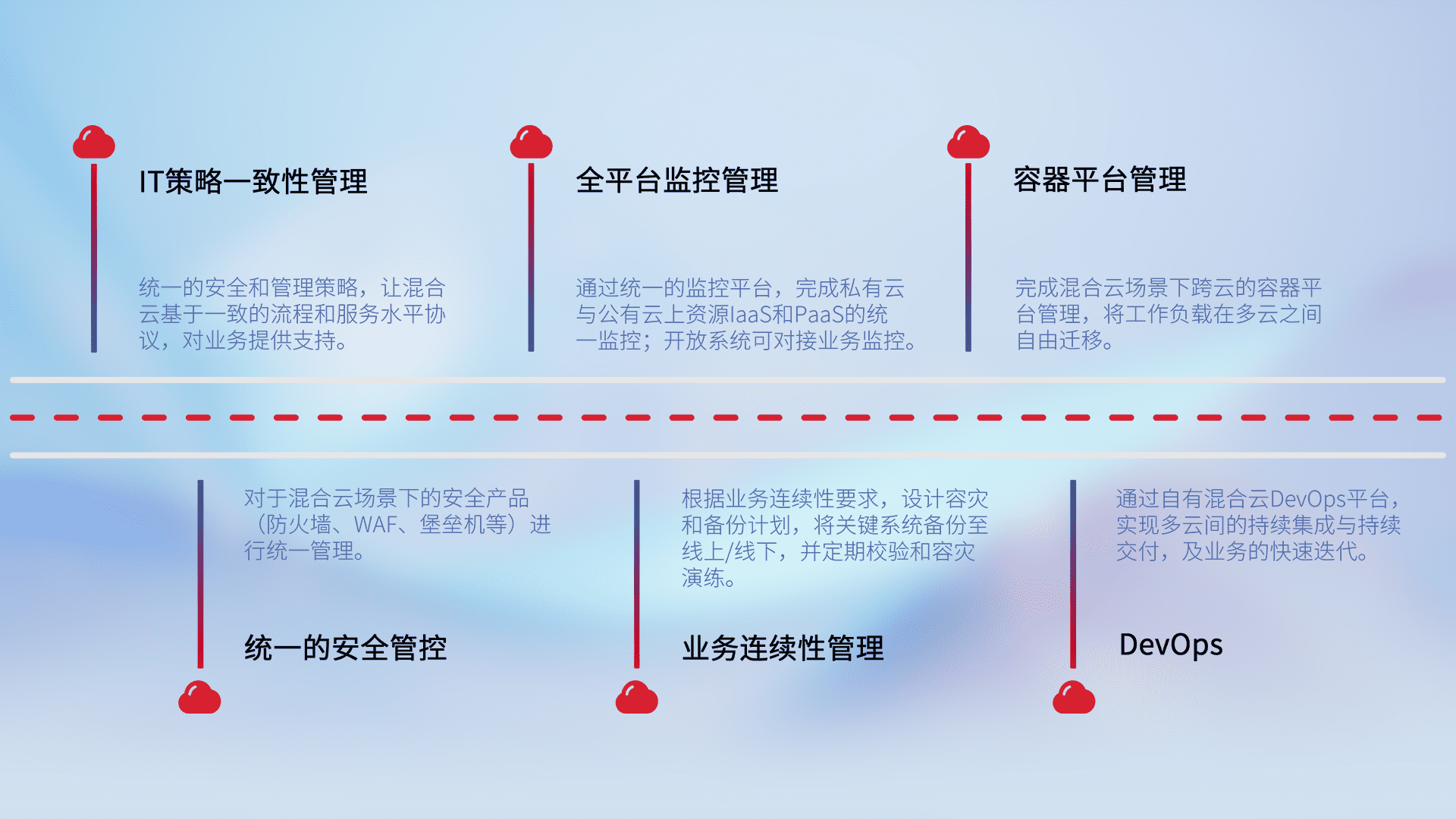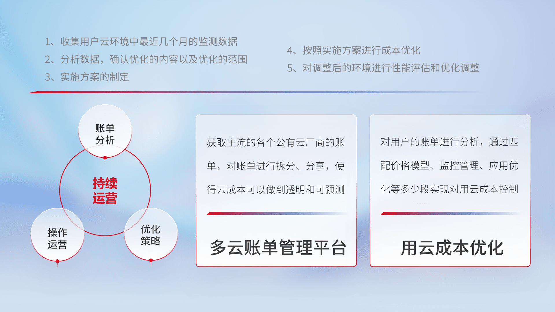 通过多云纳管,,,以统一的资源数据模型把客户的云资源进行抽象和封装,,,,进而实现对多云资源的统一操作,,保障云资源管理的可靠性、、稳定性与可用性。。。量身定制化运维内容,,配置、、开发运维、、、、补丁管理、、备份、、监控、、认证和访问管理、、、、审计和日常巡检等,,,保障在用云过程中的可靠度,,稳定度以及高可用率。。。