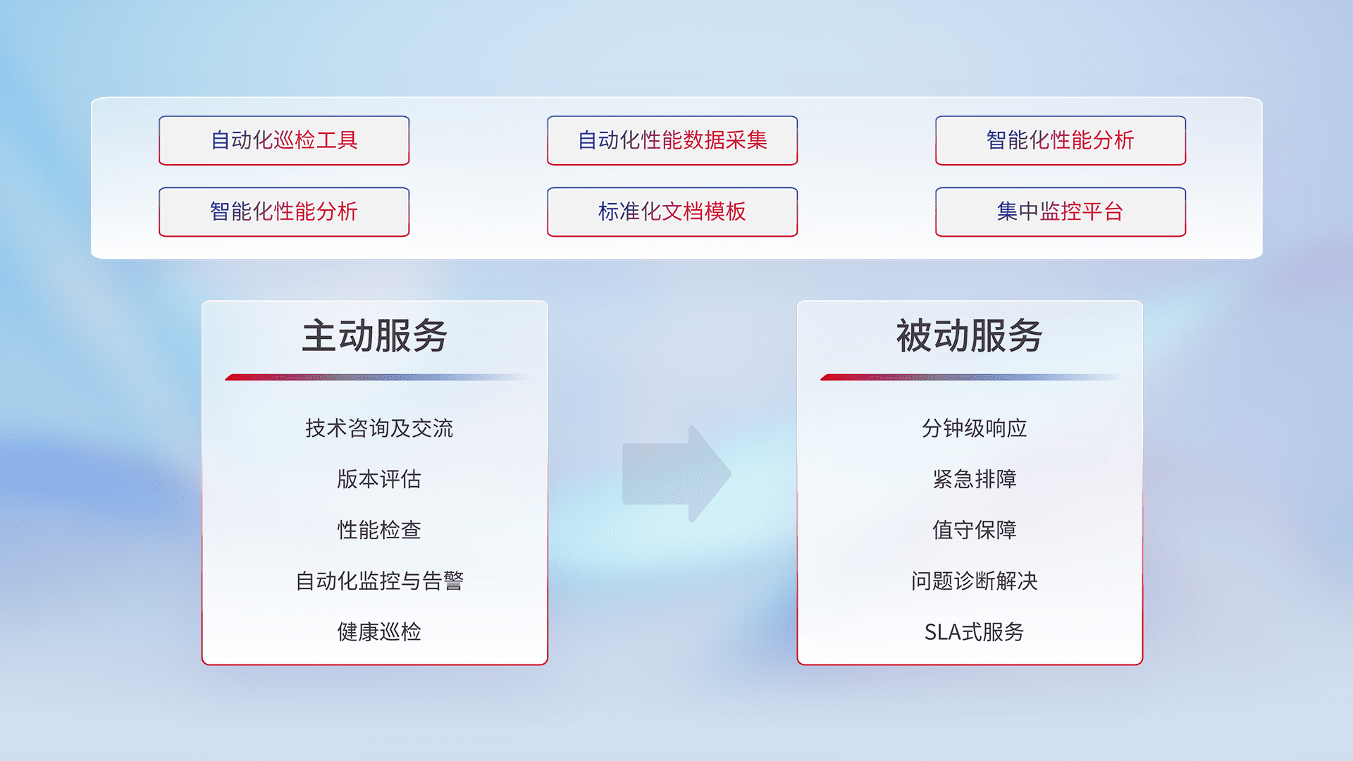 智能化工具和标准化文档,,,保障服务质量,,提供主动服务(包含技术咨询、、版本评估、、、性能检查、、、自动化监控与告警、、、、健康巡检)和被动服务包含(分钟级响应、、紧急排障、、、值守保障、、、问题诊断解决、、、SLA服务)。。。。